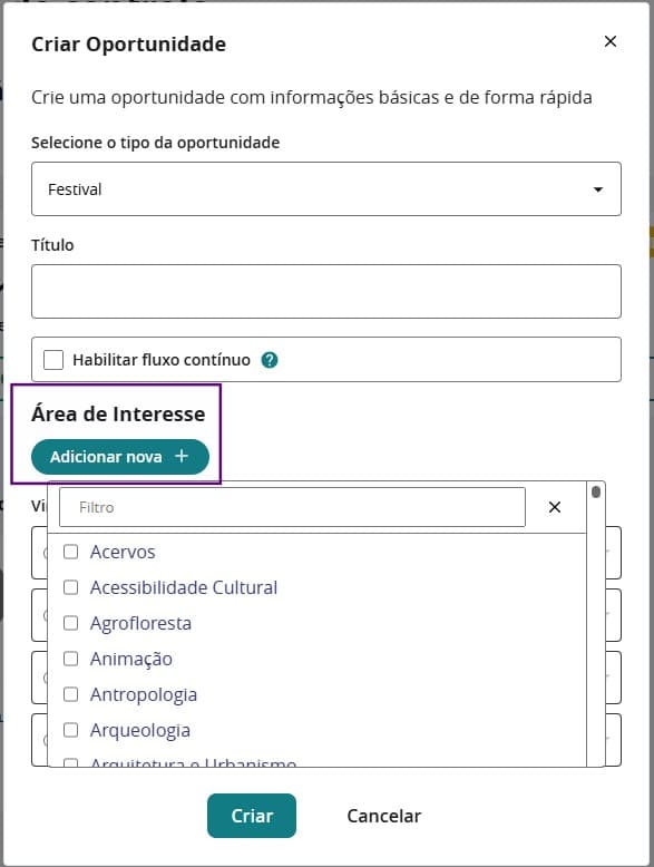 A seção de Áreas de Interesse permite categorizar a oportunidade dentro do universo cultural, facilitando a busca e identificação por agentes que atuam em determinados setores.