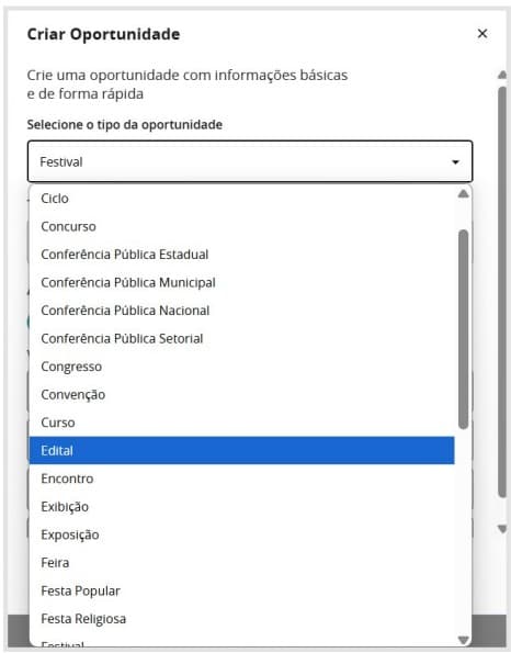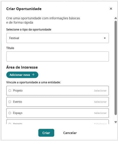 A definição correta da área de interesse aumenta a relevância da oportunidade dentro da Plataforma, garantindo que ela seja encontrada por agentes artísticos alinhados à sua proposta.